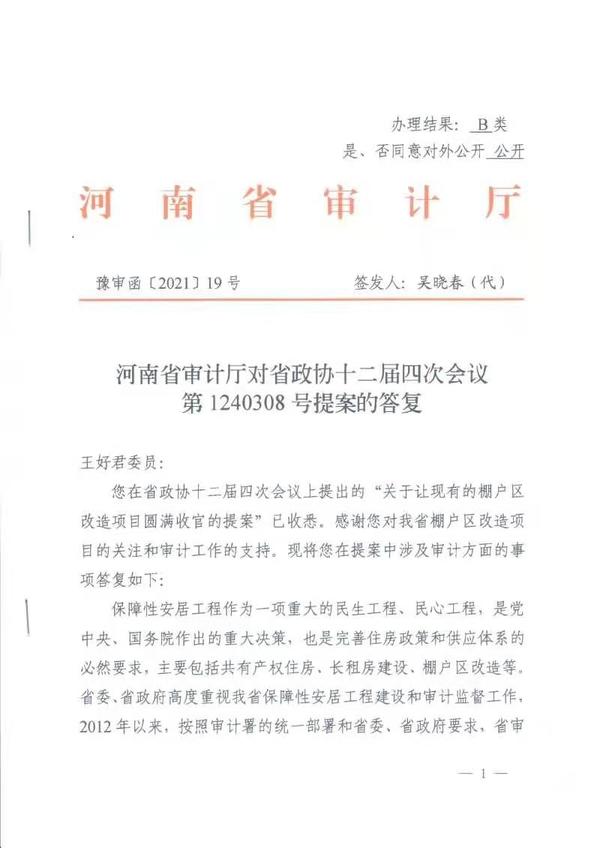 3月9日,大河網(wǎng)記者從河南省政協(xié)獲悉,河南省政協(xié)近日收到了今年的第一份提案答復(fù)文件——省審計廳關(guān)于王好君委員“讓現(xiàn)有棚戶區(qū)改造項目圓滿收官”提案的答復(fù)。