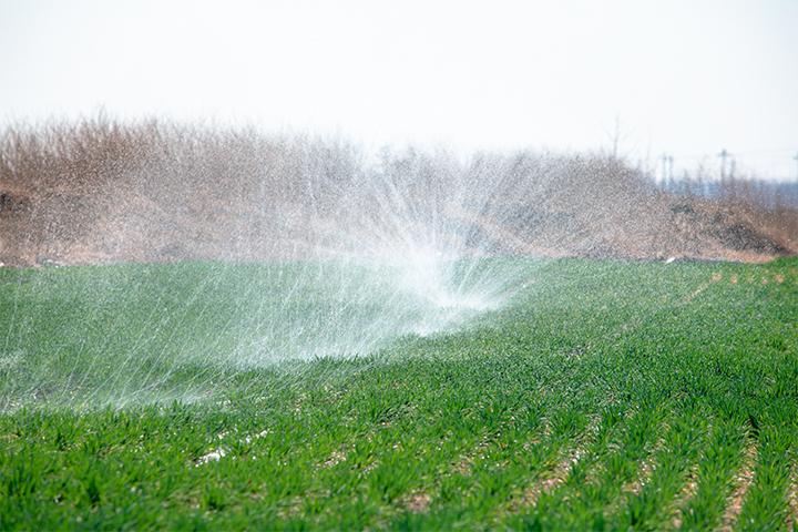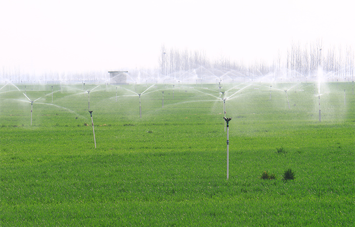 自走式噴霧機(jī)噴灑除草劑,成方連片的麥田里,一排排自動噴灌設(shè)施,噴射出一股股“雨霧”,均勻地噴灑在麥苗上,猶如天然“噴泉”,蔚為壯觀。