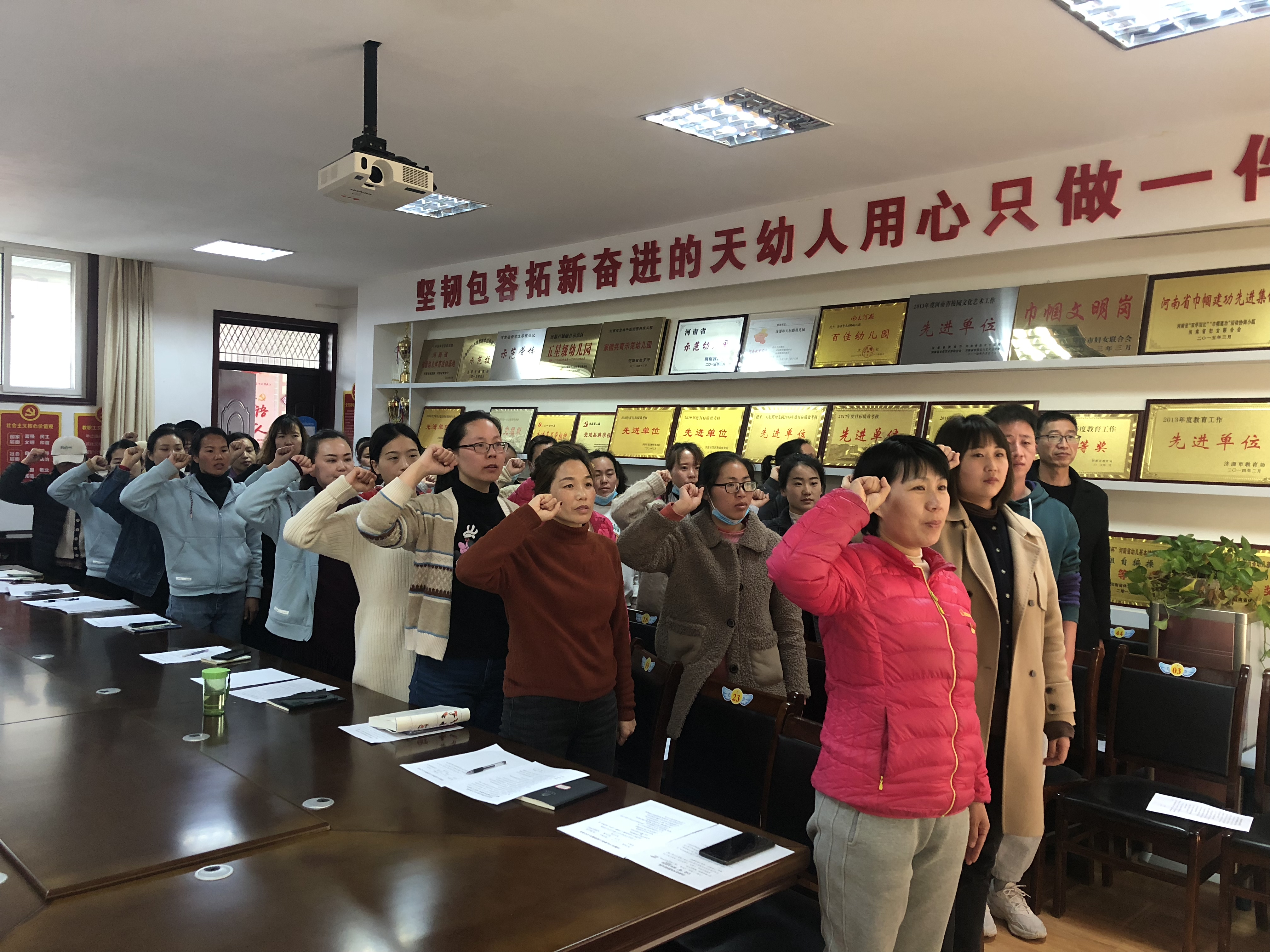 為落實教師宣誓制度、師德師風承諾制度,幼兒園在全體教師會議中開展了重溫《河南教師誓詞》活動,老師們在李園長帶領下進行莊嚴宣誓,并在承諾書上鄭重簽下了自己的名字,再次感受作為一名幼兒教師的榮譽感、使命感和責任感。