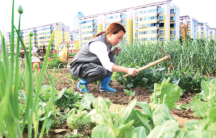 4月7日,王大姐在“都市田園圈”打理她的小菜園。