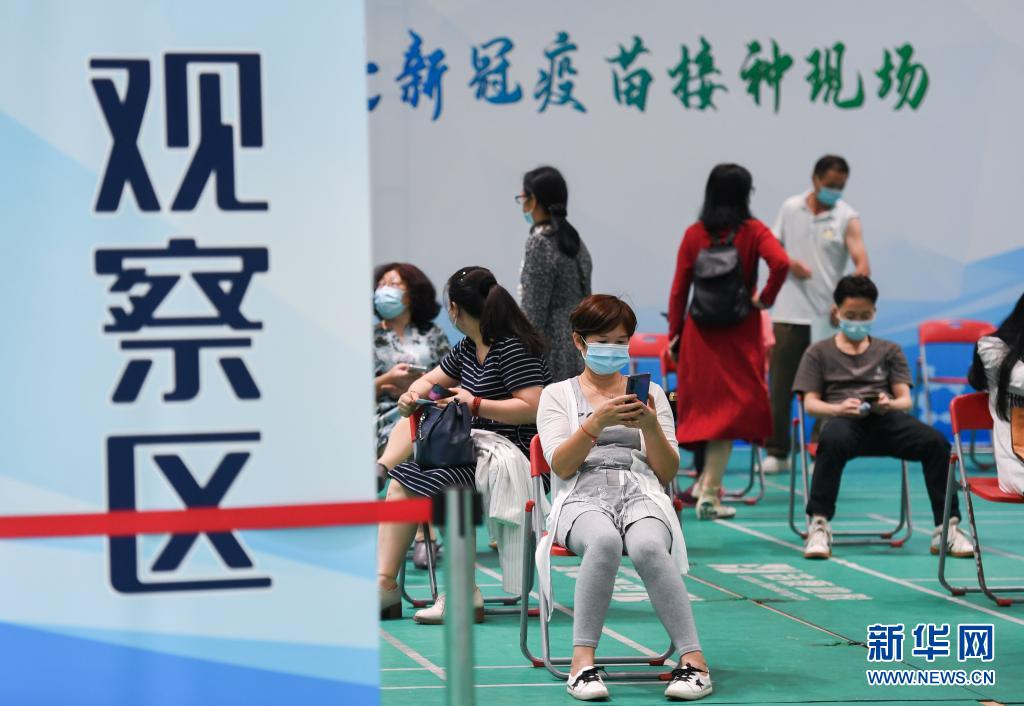 4月7日,在北京西單商業(yè)區(qū),醫(yī)護(hù)人員幫一名剛接種新冠疫苗的市民查看接種部位的情況。新華社記者 李鑫 攝