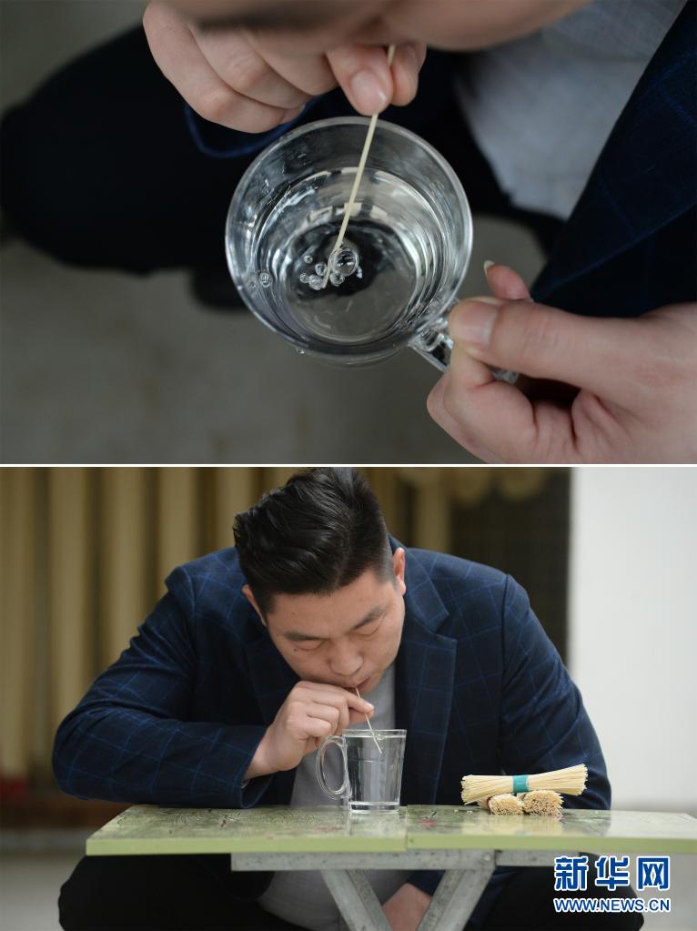 在河南省信陽市潢川縣付店鎮(zhèn)劉樓村,村黨支部書記胡曉柱通過吹氣泡的方式展示空心貢面的特點(diǎn)(3月18日攝,拼版照片)。新華社記者 馮大鵬 攝
