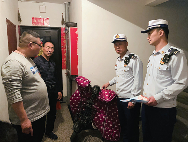 執(zhí)法人員對(duì)居民亂停亂放電動(dòng)車行為進(jìn)行勸阻