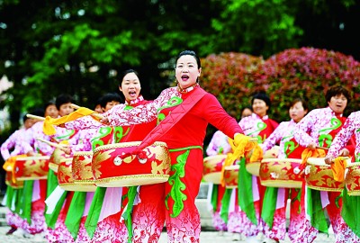 文化志愿者在商丘市夏邑縣栗城廣場表演盤鼓。苗育才 攝/光明圖片