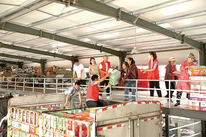 志愿者正在擺放應(yīng)急救災(zāi)物資