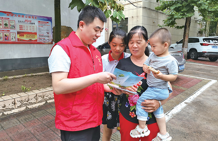 7月24日,濟(jì)源生態(tài)環(huán)境監(jiān)測中心的黨員志愿者在天壇街道高莊居委會進(jìn)行防汛安全知識宣講。 記者 王莉 攝