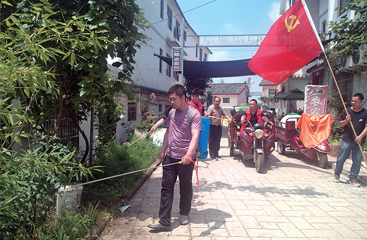 7月25日,王屋鎮(zhèn)愚公村黨員干部在對街道、學(xué)校和家戶門前進(jìn)行消殺。 記者 王莉 攝
