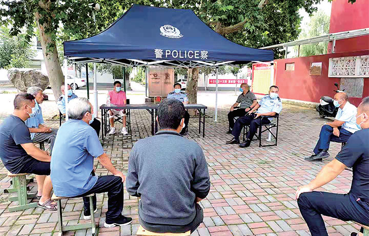 在張二杰忙著“解題”的時(shí)候,承留派出所所長謝建光也沒閑著。謝建光帶領(lǐng)民警舉辦了“流動(dòng)警務(wù)室+板凳議事會(huì)”,圍繞濟(jì)源市鴻潤苗木科技有限公司核桃采收的問題與北石村村干部、村民進(jìn)行面對面交流。“我們解決‘內(nèi)’,思禮派出所解決‘外’,內(nèi)外相結(jié)合,難題才迎刃而解?!敝x建光笑著說。