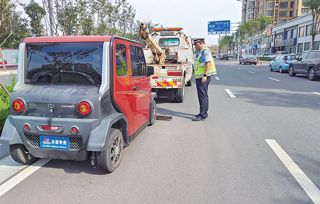 “老趙,你可看仔細(xì)了,那輛低速電動(dòng)汽車停放的地方不是停車位,屬于違章停車。電動(dòng)汽車還沒有牌照,交警沒法聯(lián)系車主,所以只能先拖走以免影響交通?!薄熬褪蔷褪牵侠钫f得對(duì),玉川街相對(duì)狹窄,這些車停放在路邊,直接將非機(jī)動(dòng)車道占據(jù)了大半,市民騎車從這里經(jīng)過,安全隱患可不小?!甭牭脚笥训挠懻?,趙斌心里的疑問被打消,默默地向執(zhí)勤民警豎起了大拇指。