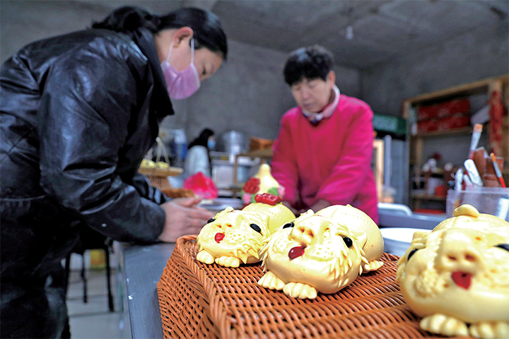 1月7日,中式面點師牛艷利正在制作“金虎”造型的面點。