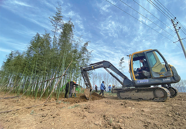 3月2日,牡丹園二期項(xiàng)目施工現(xiàn)場(chǎng),工人在栽種竹子。黃一冰 攝