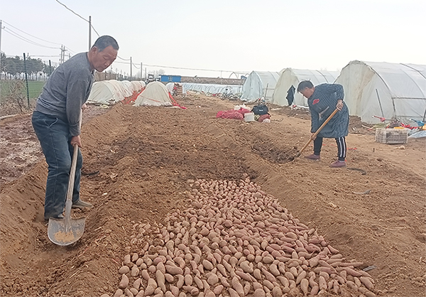 “現(xiàn)在地溫低,我們采用‘天膜+地膜’的模式,增加溫度,提高紅薯出苗率?!北R兵蹲下身子查看棚內(nèi)溫度,“這會兒棚內(nèi)溫度35℃,高溫可以促進(jìn)紅薯催芽。”