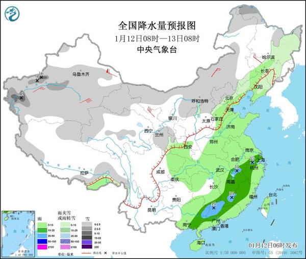 1月12日08時(shí)至13日08時(shí),新疆南疆盆地西部、甘肅西部、青海西部、內(nèi)蒙古大部、黑龍江西北部和東部、吉林和遼寧東部、華北北部等地部分地區(qū)有小到中雪或雨夾雪,其中,新疆南疆盆地和南疆西部山區(qū)等地部分地區(qū)有大到暴雪(10~16毫米)。東北地區(qū)西部、華北中南部、黃淮、江淮、江漢大部、西南地區(qū)東北部、江南、華南大部、臺(tái)灣島大部等地部分地區(qū)有小到中雨,其中,安徽南部、江西北部和南部、浙江北部、廣西東部、廣東西北部等地部分地區(qū)有大雨(25~45毫米)。新疆東部和南疆盆地、甘肅河西、內(nèi)蒙古中東部、吉林西部等地部分地區(qū)有4~6級(jí)風(fēng),其中,新疆山口地區(qū)風(fēng)力可達(dá)9~11級(jí)及以上。新疆東部和南部、青海西北部、甘肅西部和東部、內(nèi)蒙古西部、寧夏、陜西北部等地部分地區(qū)有揚(yáng)沙或浮塵,局地有沙塵暴(見圖3)。
