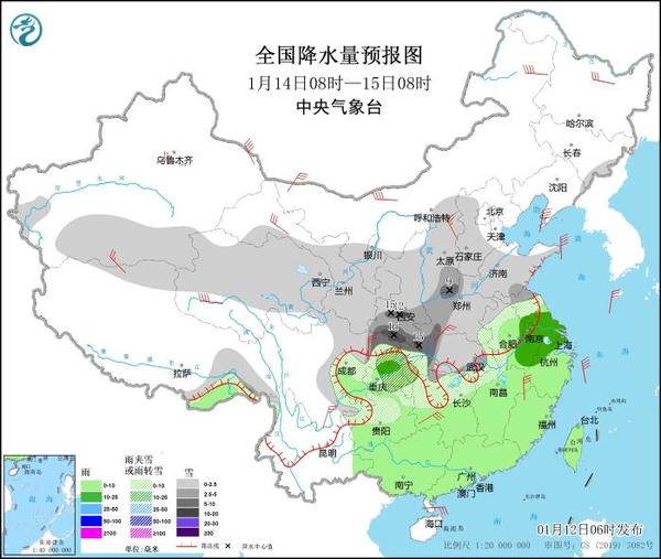 1月14日08時(shí)至15日08時(shí),新疆南部、西藏東南部、青海、甘肅中東部、寧夏、陜西、山西、河北中西部、山東、河南、湖北等地部分地區(qū)有小到中雪,其中,陜西中南部、山西南部、河南北部、湖北西部、四川盆地北部、重慶東北部等地部分地區(qū)有大到暴雪(10~15毫米)。江淮大部、江南大部、西南地區(qū)東南部、華南、臺(tái)灣島等地部分地區(qū)有小到中雨。新疆沿天山地區(qū)和南疆盆地、甘肅河西、山西北部、黑龍江東北部、河南、湖南、江西北部、四川盆地等地部分地區(qū)有4~6級(jí)風(fēng),其中,內(nèi)蒙古北部、青海西部等地部分地區(qū)有6~7級(jí)風(fēng)。渤海、渤海海峽、黃海大部海域、東海大部海域、臺(tái)灣海峽、臺(tái)灣以東洋面將有6~8級(jí)、陣風(fēng)9級(jí)的偏北風(fēng),其中渤海部分海域風(fēng)力可達(dá)9級(jí)、陣風(fēng)10~11級(jí)(見圖5)。