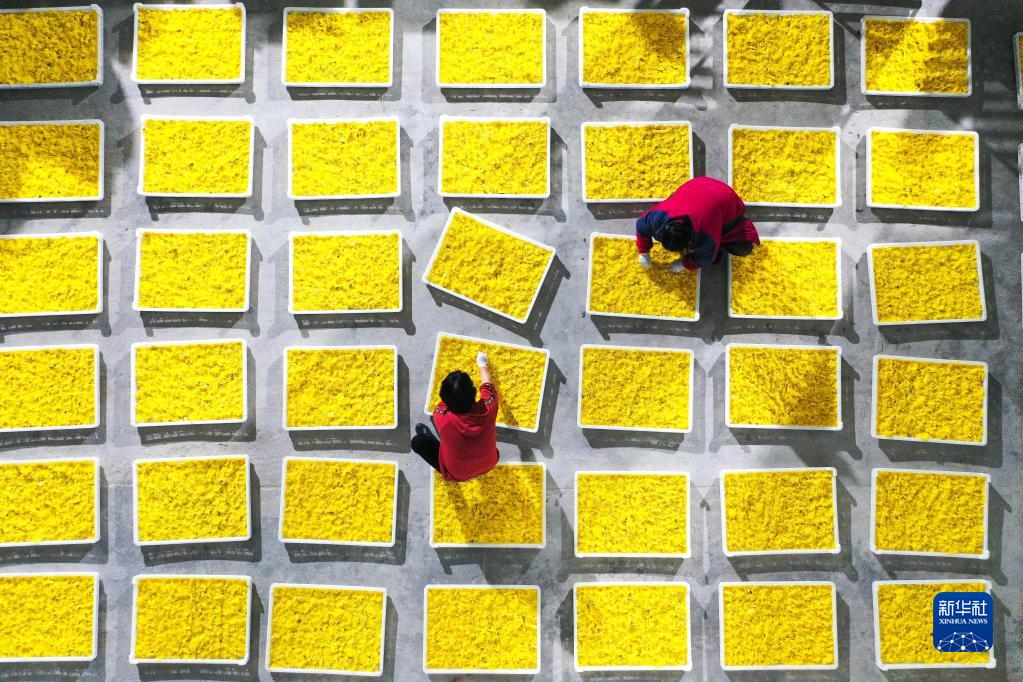 村民在貴州省貴定縣云霧鎮(zhèn)一菊花加工車(chē)間攤晾金絲皇菊(2022年10月20日攝,無(wú)人機(jī)照片)。新華社記者 楊文斌 攝