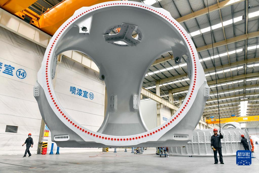 工作人員在山東省惠民縣風(fēng)電裝備產(chǎn)業(yè)基地一涂裝車(chē)間內(nèi)作業(yè)(2022年6月7日攝)。新華社記者 郭緒雷 攝