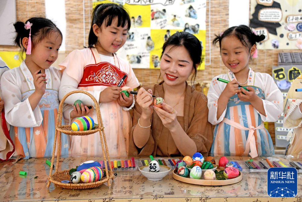 5月5日,在山東省棗莊市東湖小學(xué),學(xué)生們?cè)诶L制彩蛋。新華社發(fā)(孫中喆 攝)