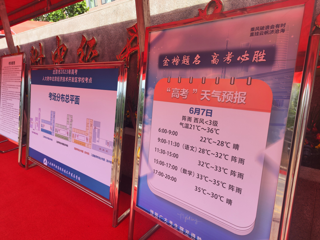 6月7日,在人大附中北京經(jīng)濟技術(shù)開發(fā)區(qū)學(xué)??键c,張貼著“高考”天氣預(yù)報等溫馨提示。新華社記者 趙琬微 攝