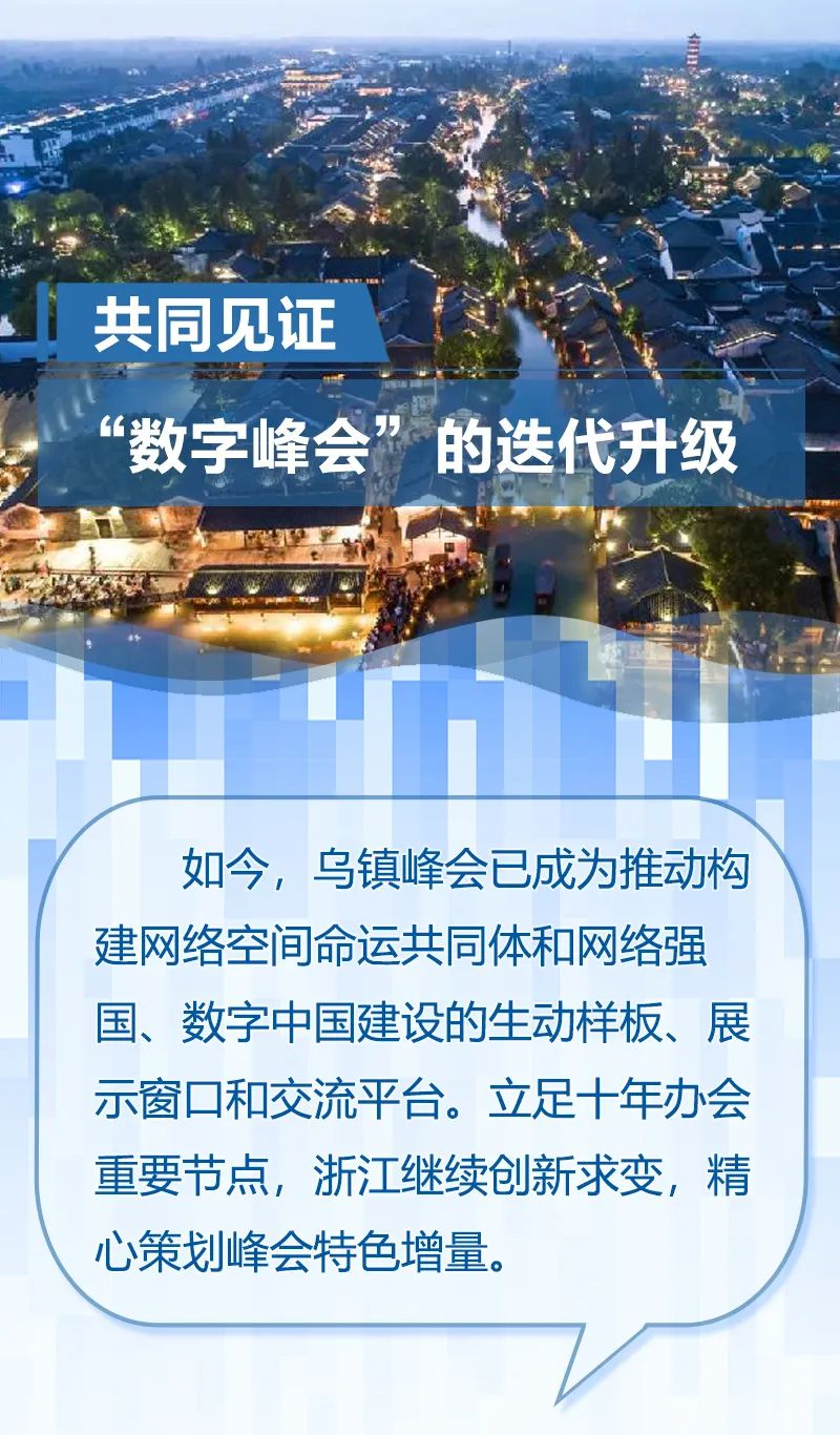 ??今年是烏鎮(zhèn)峰會辦會的第十年,又是世界互聯(lián)網(wǎng)大會國際組織正式運行一周年。對浙江來說,今年是“八八戰(zhàn)略”實施20周年、“數(shù)字浙江”建設(shè)20周年。在這個特殊重要的時間節(jié)點上舉辦世界互聯(lián)網(wǎng)大會烏鎮(zhèn)峰會,有著特別重大的意義。
