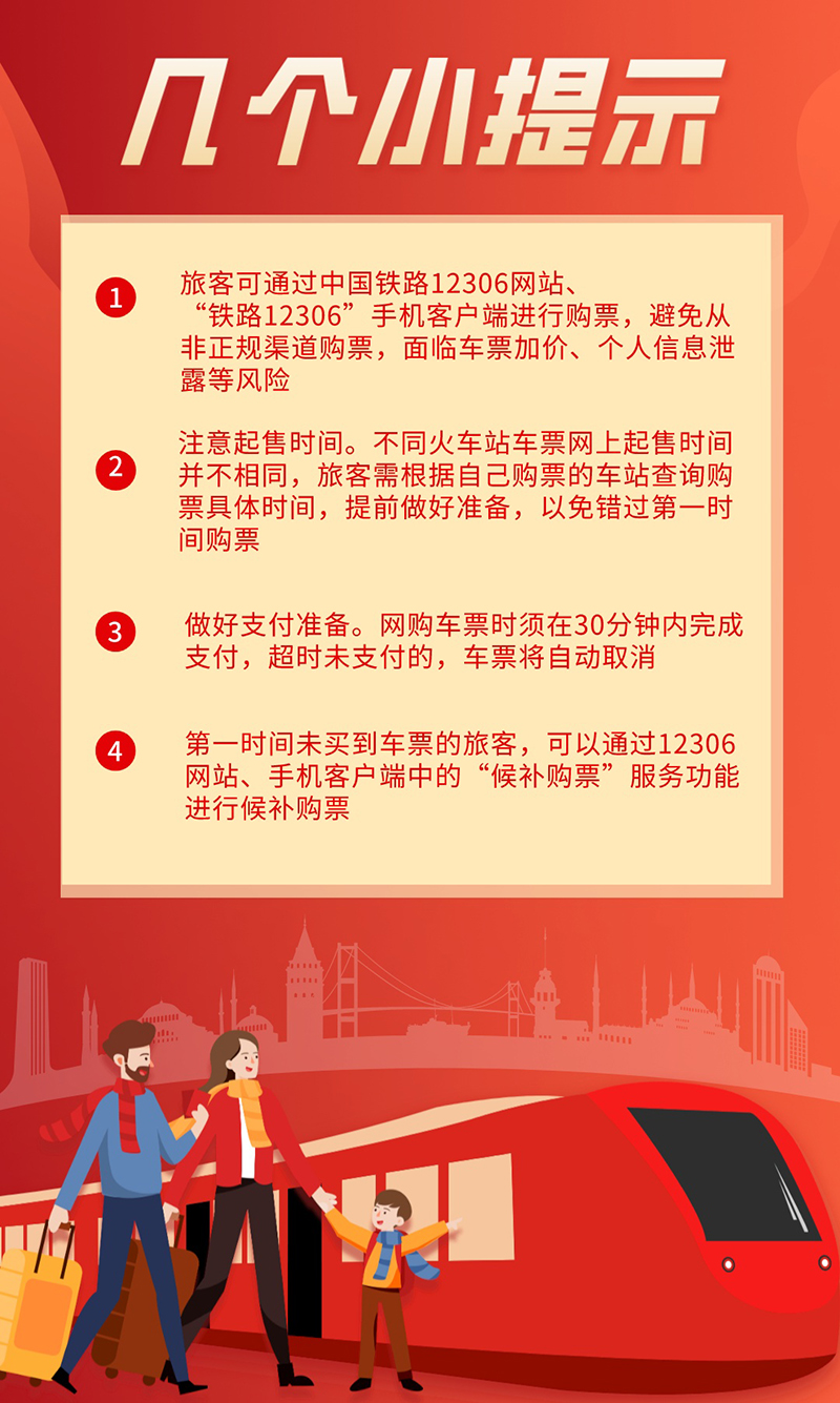 同時,鐵路12306還推出了起售提醒訂閱功能,旅客朋友可根據(jù)車票起售時間,提前通過系統(tǒng)設(shè)置多個提醒,以便及時提交購票訂單。各趟列車的車票起售時間可通過鐵路12306查詢。