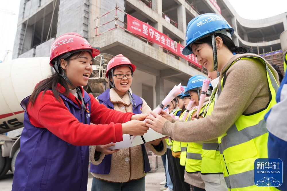 3月5日,重慶市北碚區(qū)婦聯(lián)開展“全城致敬最美的她”主題活動。北碚區(qū)婦聯(lián)的巾幗志愿者為中鐵二十二局五公司的婦女職工獻花、送上祝福。新華社發(fā)(秦廷富 攝)