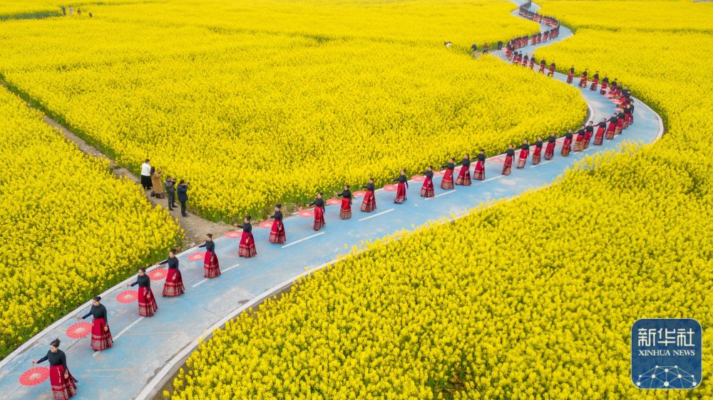 3月4日,在四川省眉山市彭山區(qū)五湖四海濕地公園油菜花田,來自眉山市老年大學(xué)的百余名漢服愛好者走秀表演(無人機照片)。新華社發(fā)(翁光建 攝)