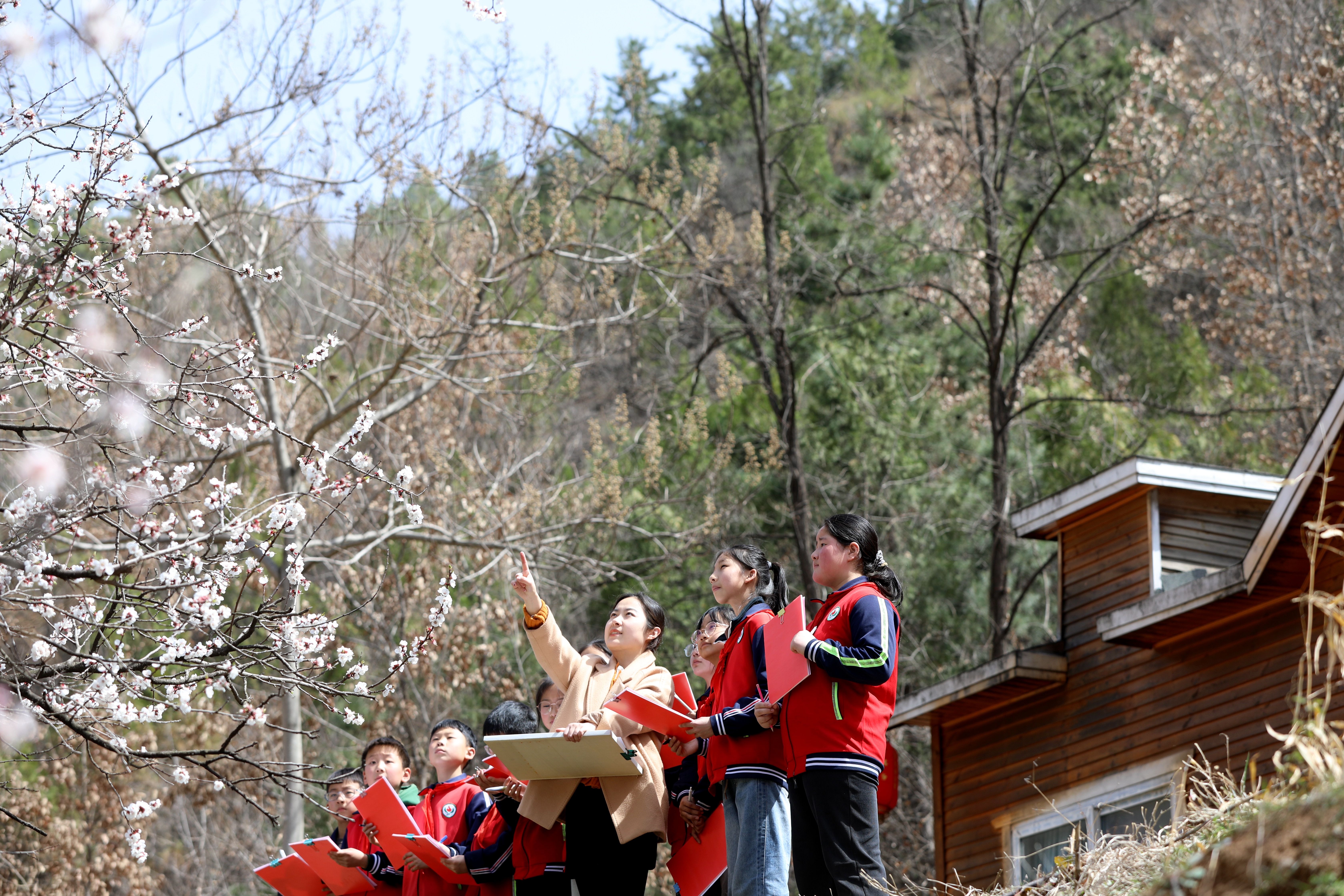 3月28日,邵原鎮(zhèn)實驗小學的學生在老師帶領(lǐng)下在媧皇谷用畫筆描繪春天美景。