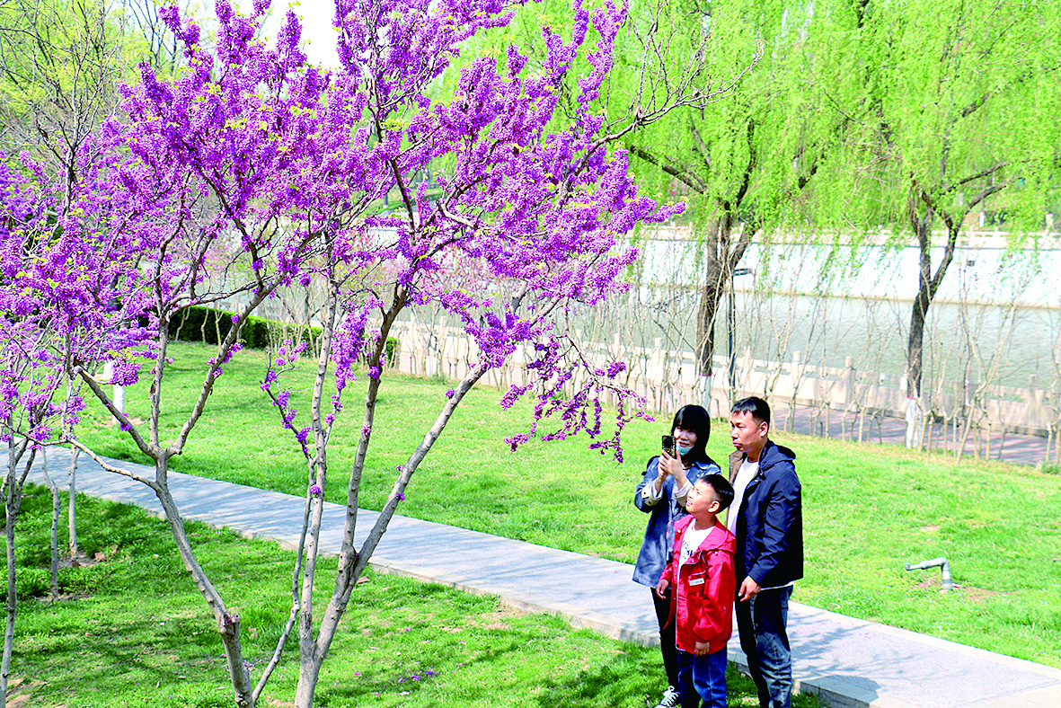 沿河兩岸,楊柳吐蕊,桃花、紫荊花、海棠花等競相綻放。春風(fēng)徐來,片片花瓣隨風(fēng)輕舞,紛飛飄落,沁人的香味撲鼻而來,讓人沉醉。好一個多色春光。