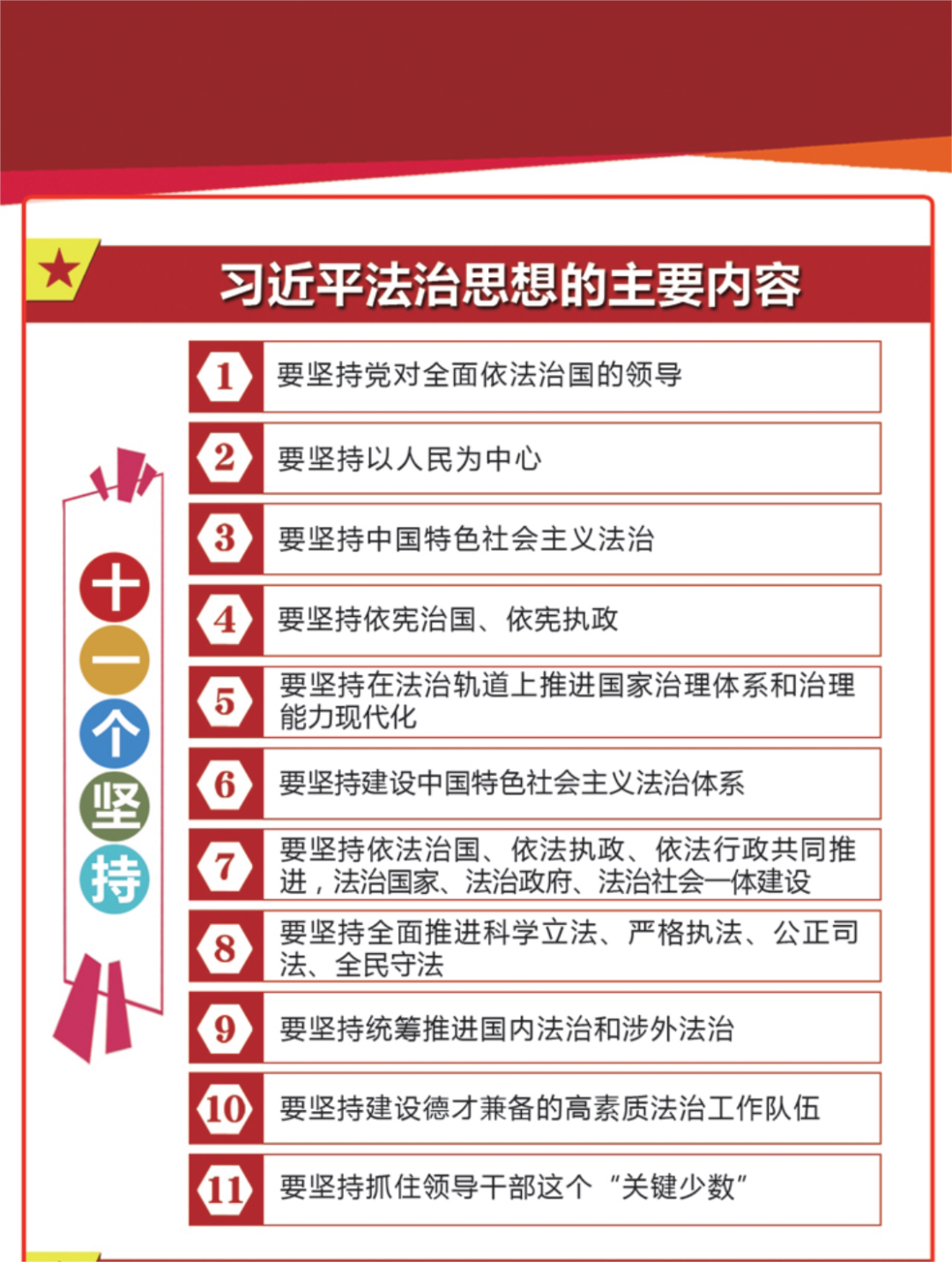 習近平法治思想既具有重大的指導作用,又具有突出的實踐性。習近平總書記將其概括為“十一個堅持”,其中每一個“堅持”都具體指明了全面依法治國的政治方向、重要地位、工作布局、重點任務、重大關系、重要保障等,恰如全面依法治國的行動方案,既為我們勾畫了為之奮斗的宏偉目標,又提出了切實可行的重大舉措。