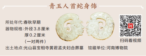 在河南博物院“逐鹿中原”東周展廳,琳瑯滿目、美輪美奐的玉器展柜中,一對(duì)精美的青玉人首蛇身飾尤為引人注目?!斑@對(duì)玉飾出土于光山縣寶相寺春秋早期黃國(guó)國(guó)君孟和夫人孟姬的合葬墓,是難得一見的藝術(shù)珍品?!焙幽喜┪镌褐v解員王陳楚說,這兩件玉飾相互對(duì)視,側(cè)面呈人首蛇身樣式,相對(duì)的人首與反向蜷曲的蛇身構(gòu)成了兩個(gè)圓環(huán)。仔細(xì)觀察你會(huì)發(fā)現(xiàn),其中一件耳佩圓環(huán)者為男性,另一件為女性,整體構(gòu)造非常生動(dòng)地表現(xiàn)了男女之間相依相偎的親密狀態(tài),充分體現(xiàn)了古人對(duì)生命和諧統(tǒng)一認(rèn)識(shí)的哲學(xué)思想。