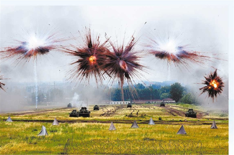 演練中,步戰(zhàn)車在煙幕彈掩護(hù)下發(fā)起戰(zhàn)斗沖擊