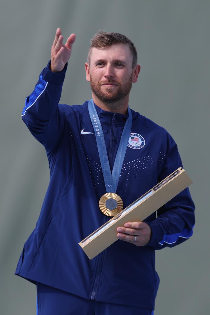 ??8月3日,射擊男子雙向飛碟冠軍美國選手漢考克在頒獎儀式上。新華社記者 趙丁喆 攝