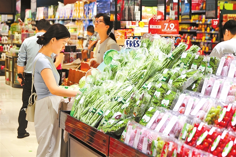 8月21日,市民在鄭州市正弘城商場(chǎng)長(zhǎng)申超市內(nèi)購(gòu)買新鮮蔬菜。 記者 聶冬晗 攝