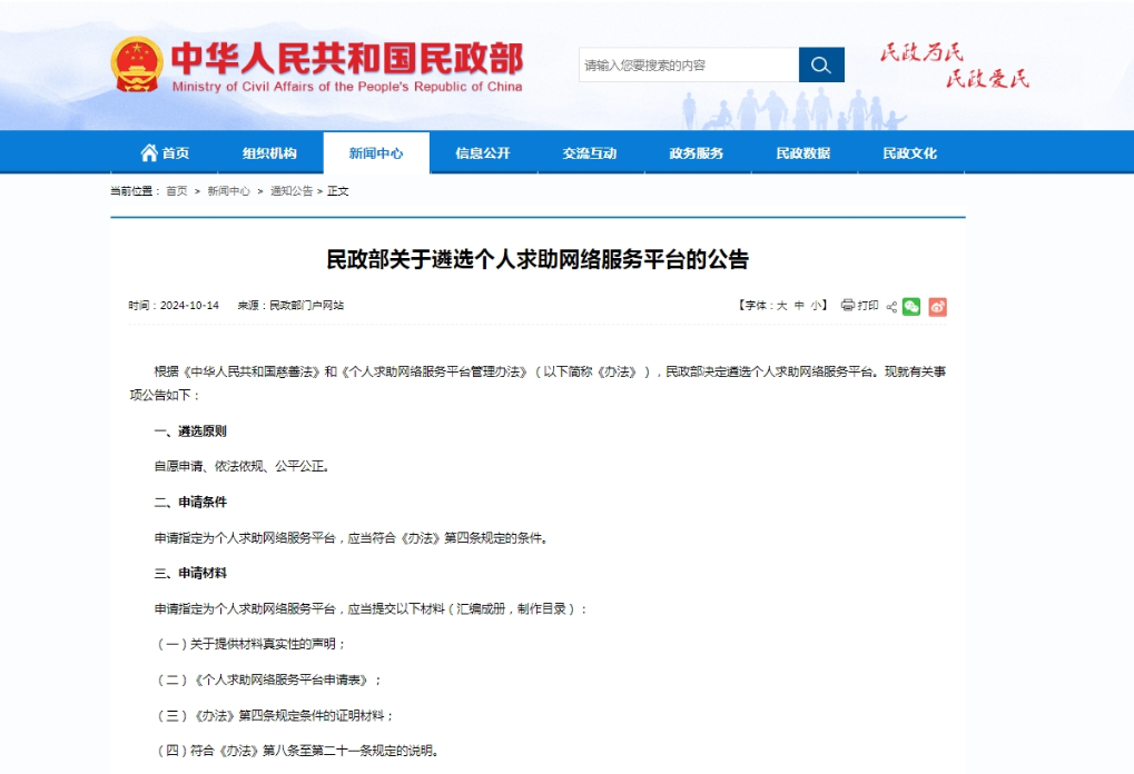 民政部發(fā)布公告遴選個人求助網(wǎng)絡(luò)服務(wù)平臺