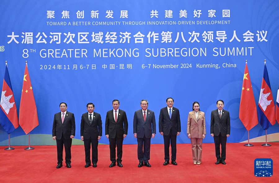 11月7日,國(guó)務(wù)院總理李強(qiáng)在昆明出席大湄公河次區(qū)域經(jīng)濟(jì)合作第八次領(lǐng)導(dǎo)人會(huì)議。這是李強(qiáng)同出席會(huì)議的柬埔寨、老撾、緬甸、泰國(guó)、越南政府首腦和亞洲開發(fā)銀行行長(zhǎng)合影。新華社記者 殷博古 攝