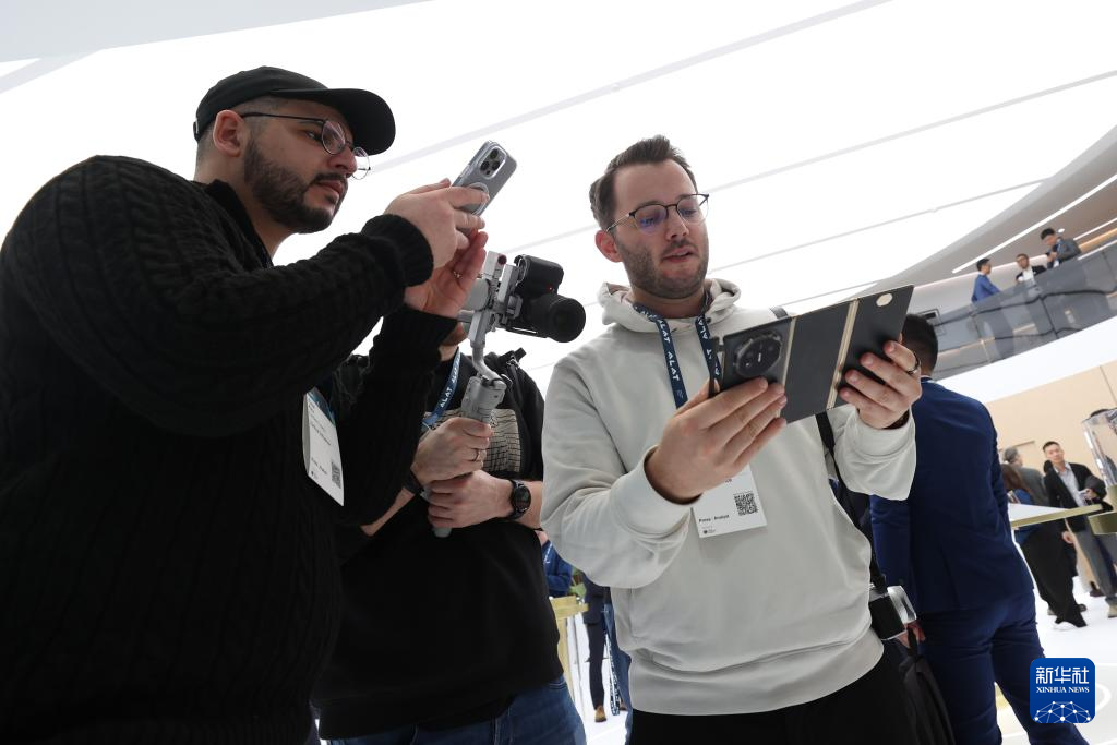 3月3日,在西班牙巴塞羅那舉行的2025年世界移動通信大會上,參觀者拍攝手機展品。新華社記者 趙丁喆 攝