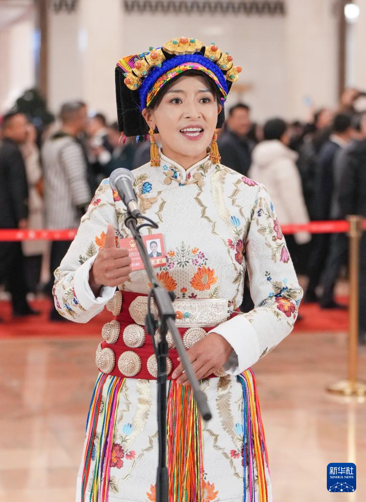 3月5日,第十四屆全國(guó)人民代表大會(huì)第三次會(huì)議首場(chǎng)“代表通道”集中采訪活動(dòng)在北京人民大會(huì)堂舉行。這是全國(guó)人大代表格西王姆接受媒體采訪。新華社記者 劉大偉 攝