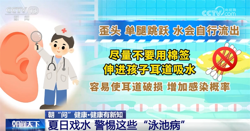 除了皮膚以外,兒童游泳還要特別注意耳朵的相關(guān)疾病。醫(yī)生提醒,孩子在游泳時,如果耳道進水不要慌張,耳道里面有鼓膜,水是不會透過鼓膜進入內(nèi)耳的。孩子只要歪頭、單腿跳躍,水就會自行流出。家長盡量不要用棉簽伸進孩子耳道吸水,這容易使耳道破損,增加感染概率。