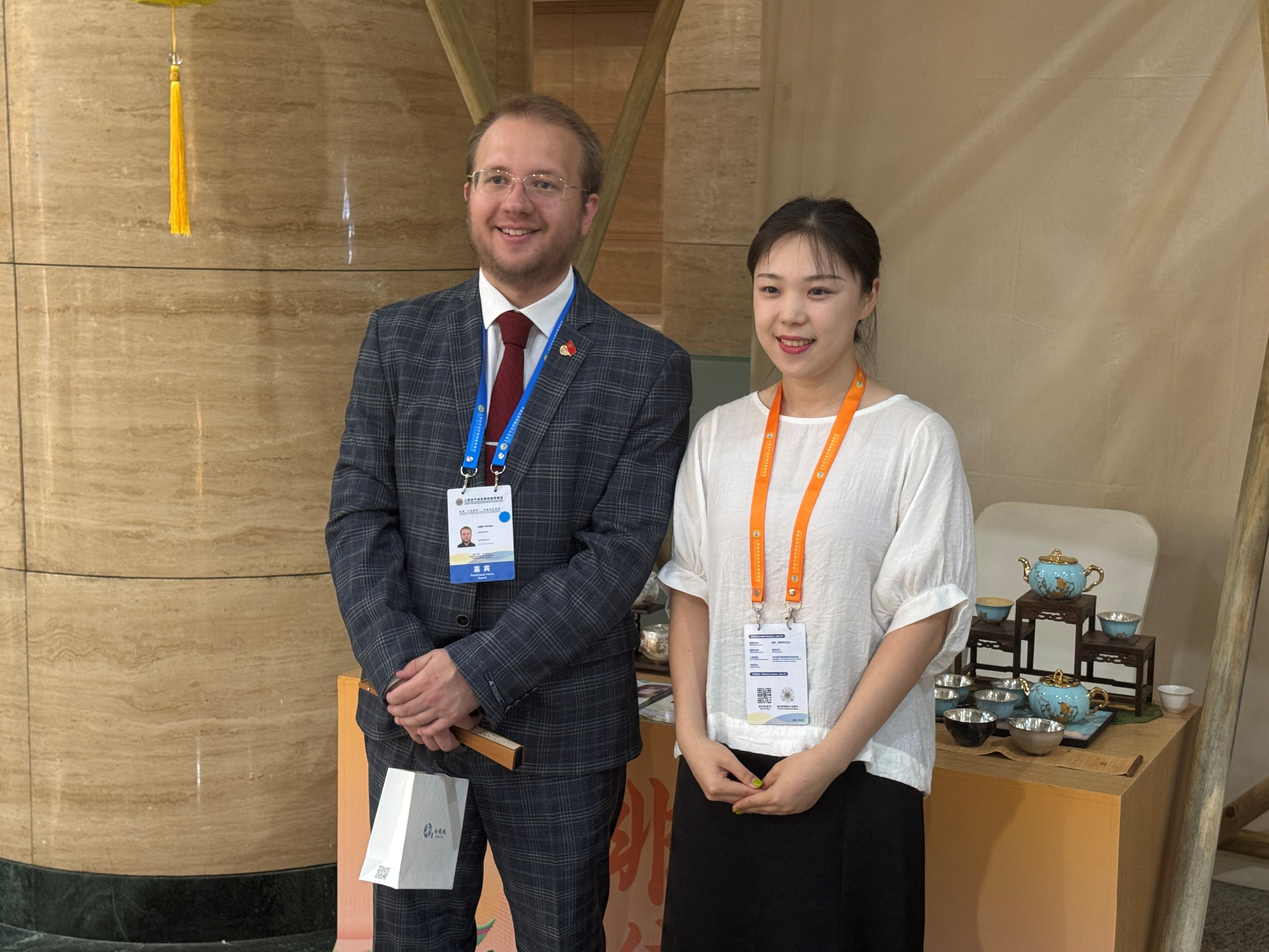 俄羅斯烏拉爾聯(lián)邦大學(xué)中國與亞太研究中心執(zhí)行主任尼基塔·科爾涅夫(Nikita Kornev)在展位前拍照留念。王浩然 攝