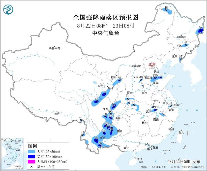 ??預(yù)計(jì),8月22日8時(shí)至23日8時(shí),黑龍江西北部和東部、吉林中部、遼寧東部、青海東南部、甘肅中南部、寧夏中部、陜西南部、山西東部、山東北部、湖北東部和西部、江西北部、川西高原北部、四川盆地中西部和南部、貴州西部、云南中東部和西南部等地部分地區(qū)有大到暴雨,其中,山東北部、四川盆地南部、云南東北部等地局地有大暴雨(100~180毫米)。上述部分地區(qū)伴有短時(shí)強(qiáng)降水(最大小時(shí)降雨量20~50毫米,局地可超過70毫米),局地有雷暴大風(fēng)等強(qiáng)對流天氣。