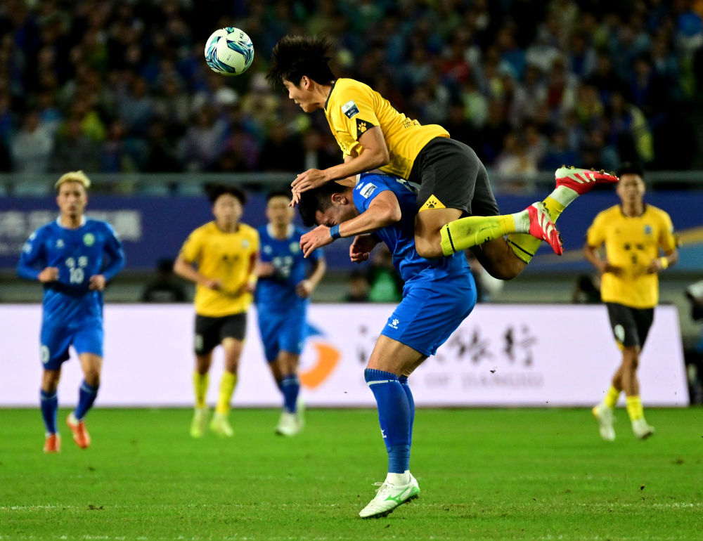 ??2025年10月18日,在“蘇超”半決賽中,泰州隊(duì)球員(上)與南京隊(duì)球員爭(zhēng)頂頭球。新華社發(fā)(曹政 攝)
