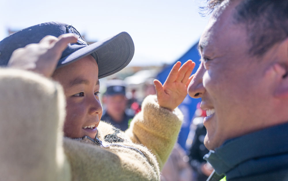 ??2025年1月14日,在西藏定日縣長(zhǎng)所鄉(xiāng)嘎布村,一名小朋友戴上移民警察米瑪次仁的帽子敬禮。新華社記者 丁增尼達(dá) 攝