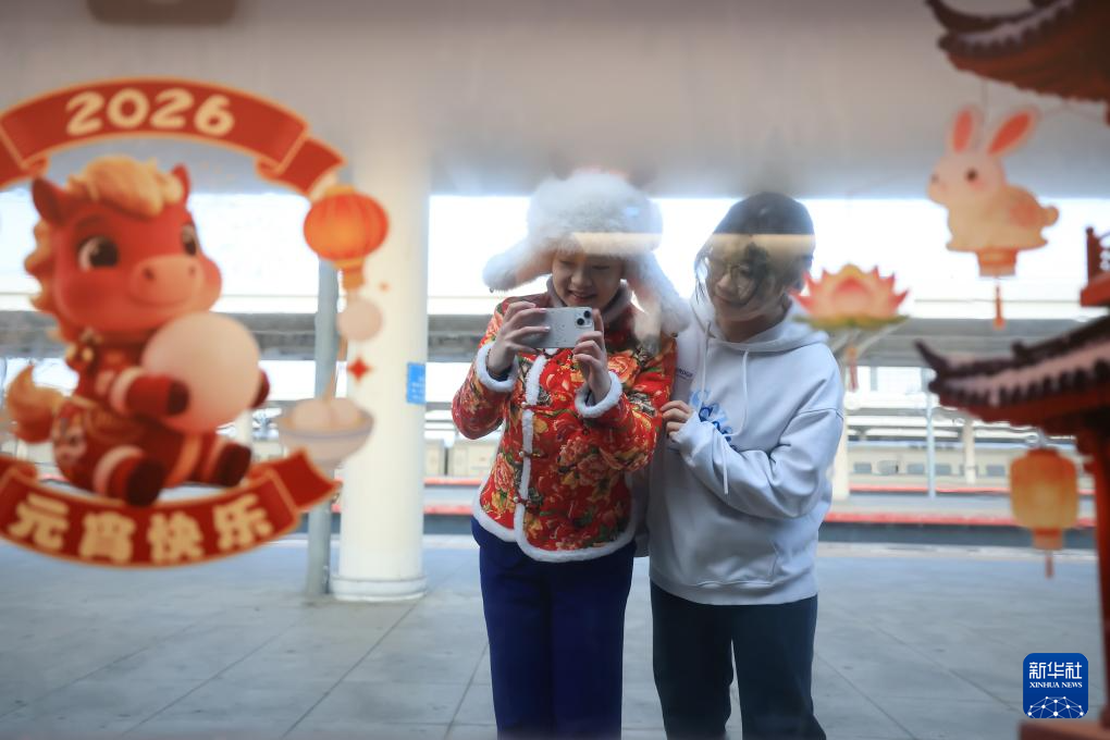 3月1日,旅客在齊齊哈爾站站臺(tái)上拍攝G1280次列車上的元宵節(jié)裝飾。