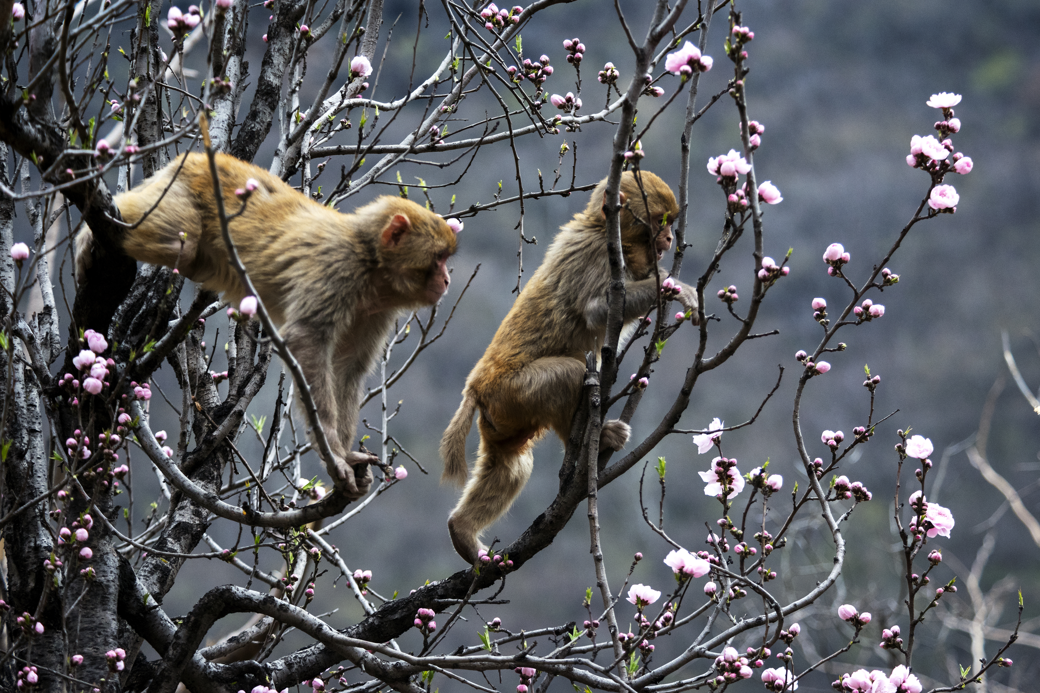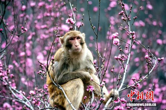太行獼猴在樹枝上“賞花”。